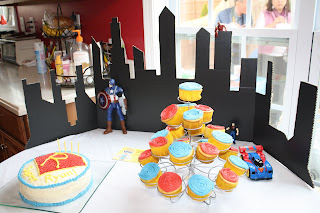 Chris did an awesome job of following my vision for a skyline cut out and totally did this for me! I told him it was "as good or better than I could have done myself", but he already knew that. :) It looked great and I was so happy with it! I also envisioned superhero's hanging from it, but as we have various sized ones, he did great about putting them out to make it look somewhat proportioned. (click a picture to enlarge it. You can see a little of the invitation that didn't get framed before the party--oops!)